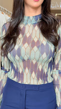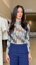Blusa em tule estampado geométrico com mangas longas e gola alta, moderna e elegante para composições cheias de estilo.