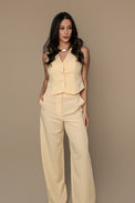 O colete apresenta modelagem acinturada com decote em “V”, fechamento frontal por botões e recorte que valoriza a silhueta. Peça versátil, pode ser usada sozinha ou sobreposta a camisas para um visual mais clássico.