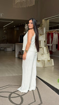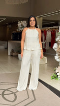 A blusa apresenta um delicado plissado que proporciona um caimento suave, enquanto a calça ampla complementa a silhueta com um toque de leveza. Ideal para diversas ocasiões, desde um dia no escritório até um evento à noite, este conjunto é a escolha perfeita para se destacar.