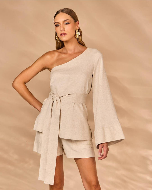 Blusa Um Ombro Só Linho Com Faixa Natural
