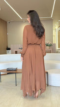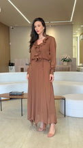 Conjunto elegante e delicado composto por blusa longa com babados frontais e decote em “V”, que traz leveza e romantismo ao visual. Acompanha saia midi soltinha com acabamento em pontas, confeccionada em tecido leve e fluído, garantindo movimento e conforto. Perfeito para produções sofisticadas e cheias de estilo.