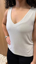 Regata canelada em tom cinza, com decote V profundo e modelagem reta. Básica e elegante para combinações versáteis.