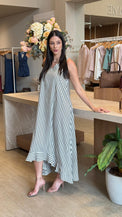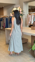 Elegante e versátil, este vestido possui caimento leve e fluido, garantindo conforto e movimento a cada passo. O design cavado valoriza a silhueta de forma sofisticada, enquanto as listras modernas alongam o visual e trazem um toque atemporal. Perfeito para compor looks frescos e charmosos em diversas ocasiões.
