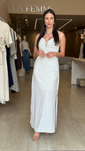 Vestido midi em tecido de poá, com alcinhas finas e fendas laterais duplas, que trazem movimento e leveza à peça. O detalhe de fivela no busto valoriza o decote e adiciona um toque moderno e sofisticado. Um modelo versátil, perfeito para compor produções elegantes e frescas para o dia ou a noite.